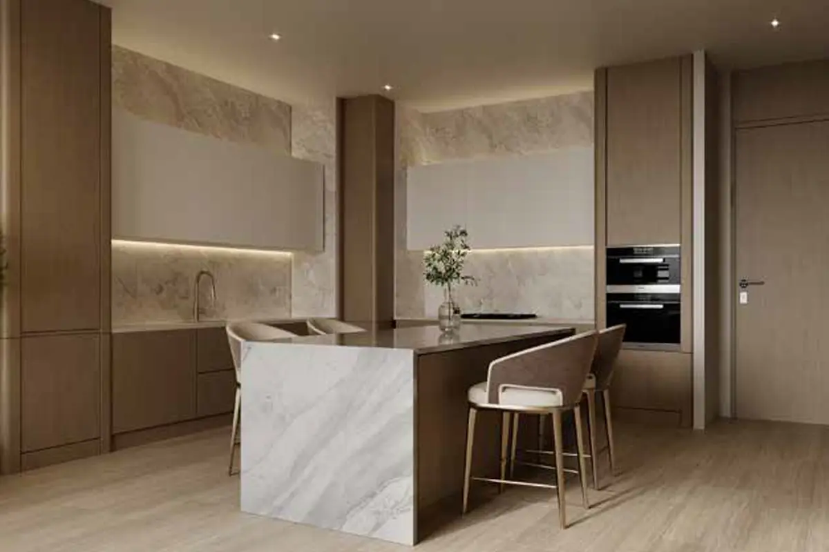 Premium material palette & fit-out: Travertine and emerald marble, wood veneer, and brushed-brass fittings deliver a premium look that ages well and supports stronger resale values.