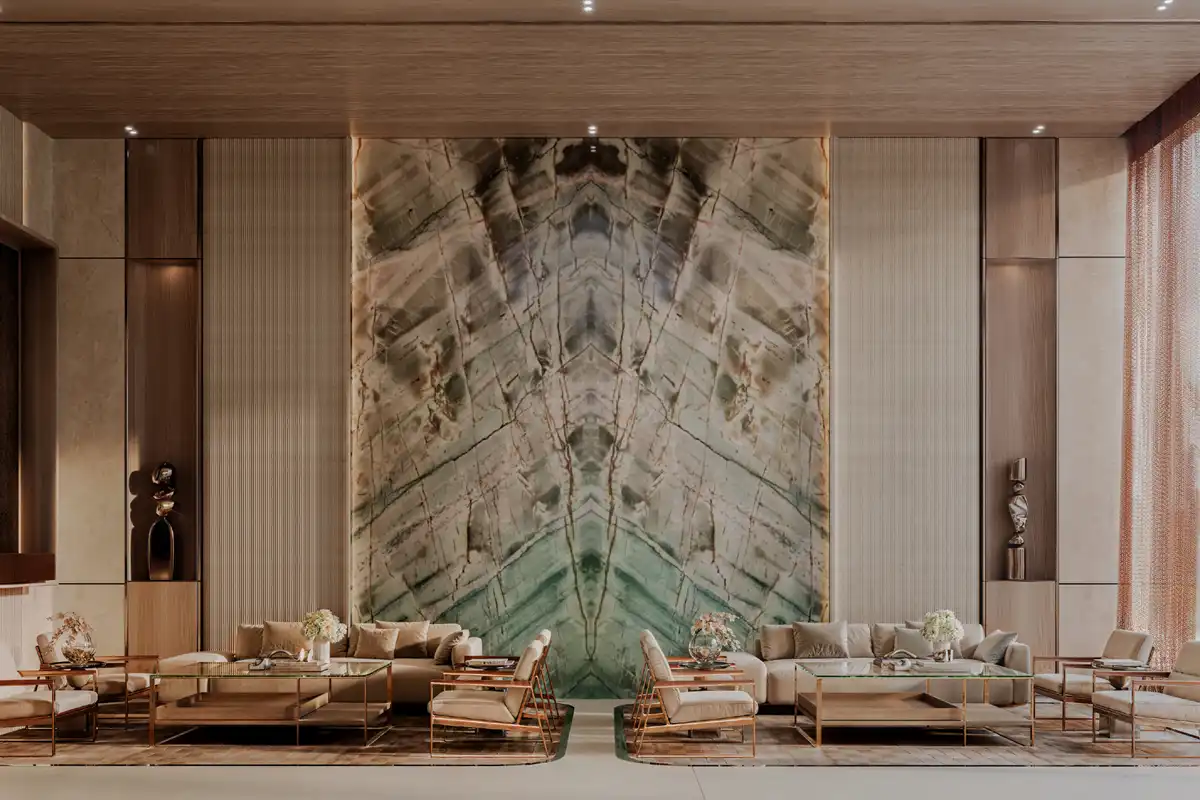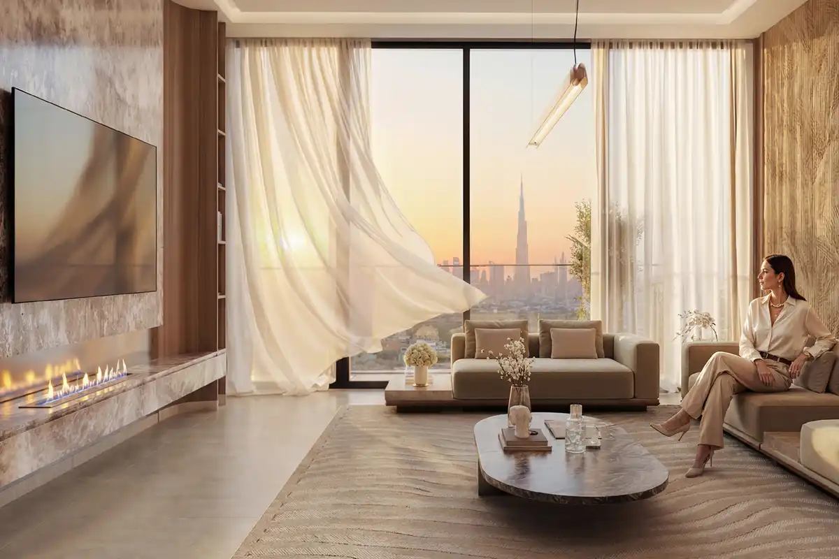 Binghatti’s design philosophy emphasises restraint and material quality. Interiors feature oak wood elements, marble countertops, aged bronze metal accents, and glass mesh detailing. Colour palettes are deliberately subdued, with hand‑aged stone and bespoke finishes lending tactile depth. Floor plans encourage free movement of light across living spaces, and each residence is positioned to maximise city views while maintaining privacy. Safety and comfort are enhanced through 24‑hour monitoring and modern surveillance systems.
