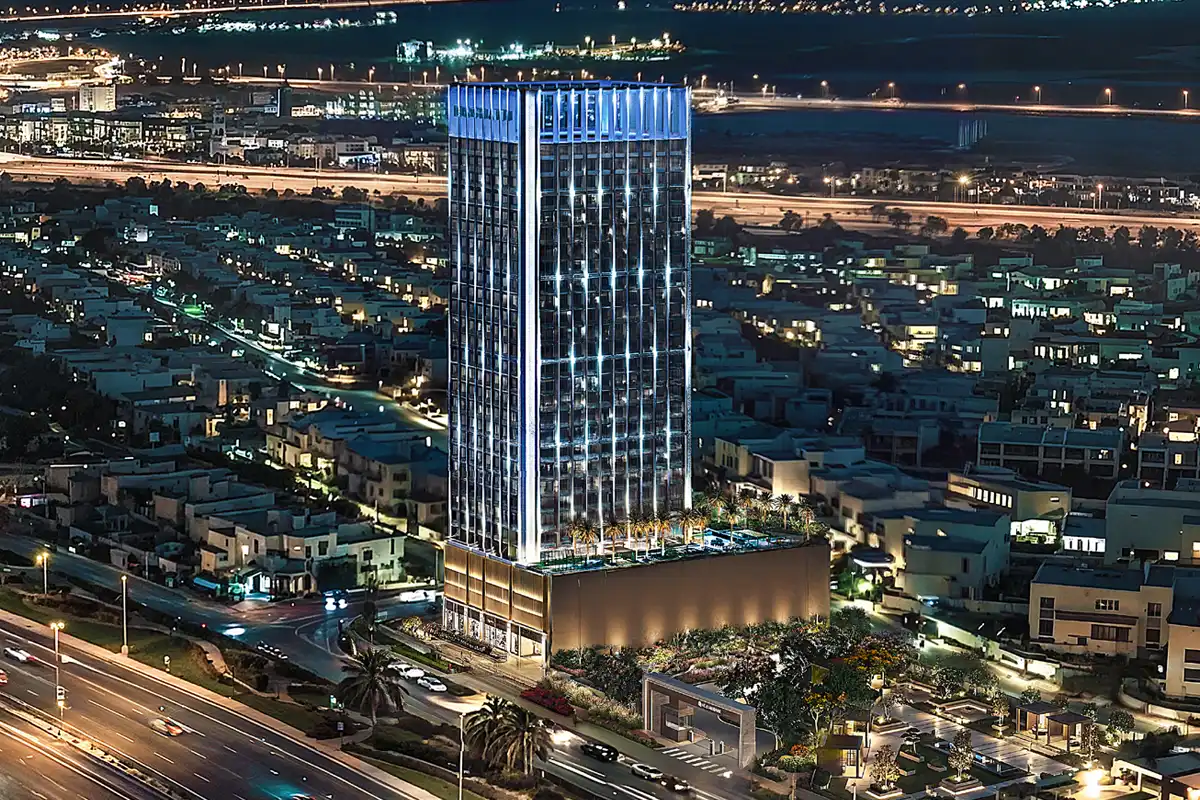 Binghatti Luxuria is a residential and retail tower situated within District 4 of Jumeirah Village Triangle (JVT), a master‑planned neighbourhood in New Dubai. The project combines ground‑floor shops and podium‑level parking with a slender high‑rise that introduces a contemporary grid aesthetic to its surroundings. The tower rises from three basement levels and a ground‑floor retail hub through four podium levels to 24 residential floors, with a mechanical floor and rooftop above. Its satin‑chrome exoskeleton acts as solar shading and provides residents with enhanced privacy. Deep, stepped terraces encourage natural light while creating shaded outdoor spaces and softening the building’s mass.