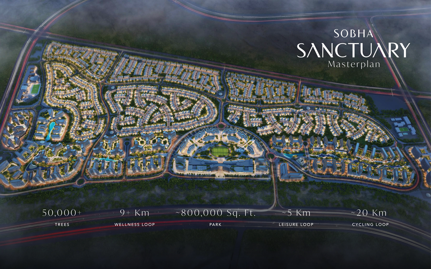 Sobha Sanctuary is a large-scale, nature‑led residential community in Dubailand. It spans roughly 37.5 million square feet of open green space and is planned to host around 20 000 families. The master plan centres on a vast park of about 800 000 sq ft and a continuous green spine, with approximately half of the land reserved for parks, water bodies, and community facilities. Forest‑inspired villa neighbourhoods sit alongside apartment clusters, allowing the development to support schools, healthcare, and retail without sacrificing privacy. The community is designed around wellness, with a six‑kilometre leisure loop, a nine‑kilometre wellness loop, and extensive cycling networks. More than 50 000 trees and shaded trails create a cooler microclimate, while green corridors link residences to amenities such as a community mall, wellness centre, international schools, and a hospital.